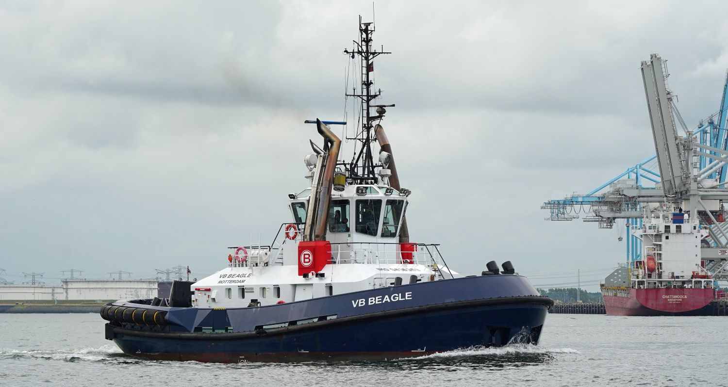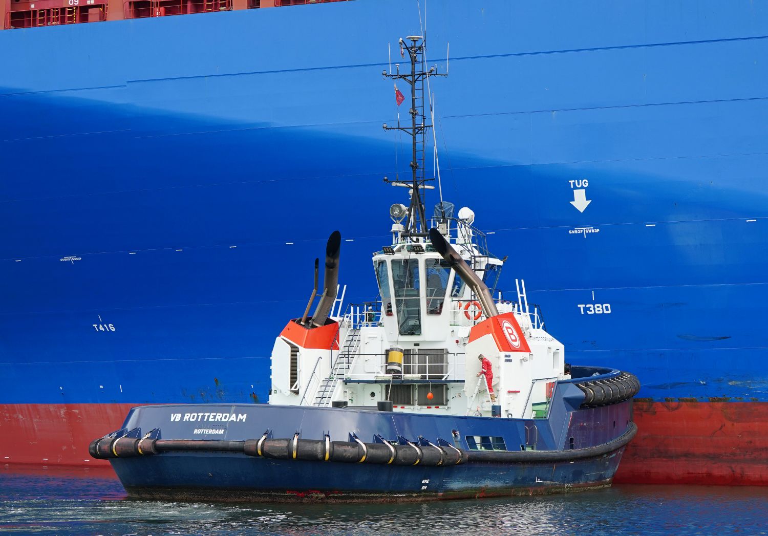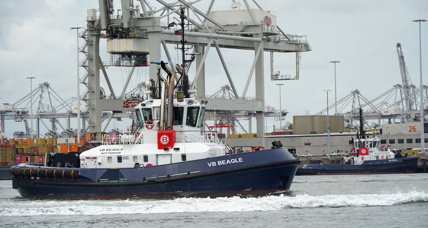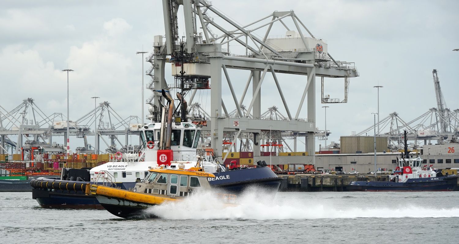 VB BEAGLE en VB ROTTERDAM van Boluda towage assisteerden het containerschip COSCO GALAXY met vertrek van de Euromax terminal in de Yangtzehaven Maasvlakte 1, gezien zondag 27-7-2025 vanaf de VEERWEL.