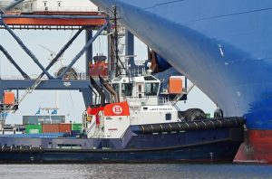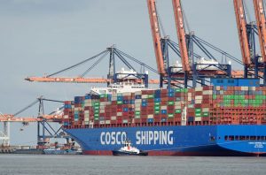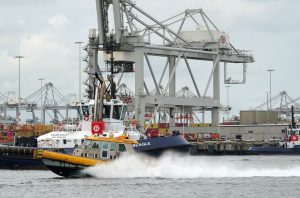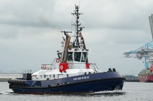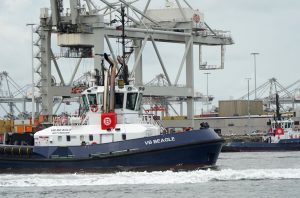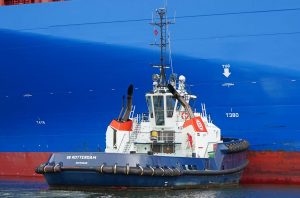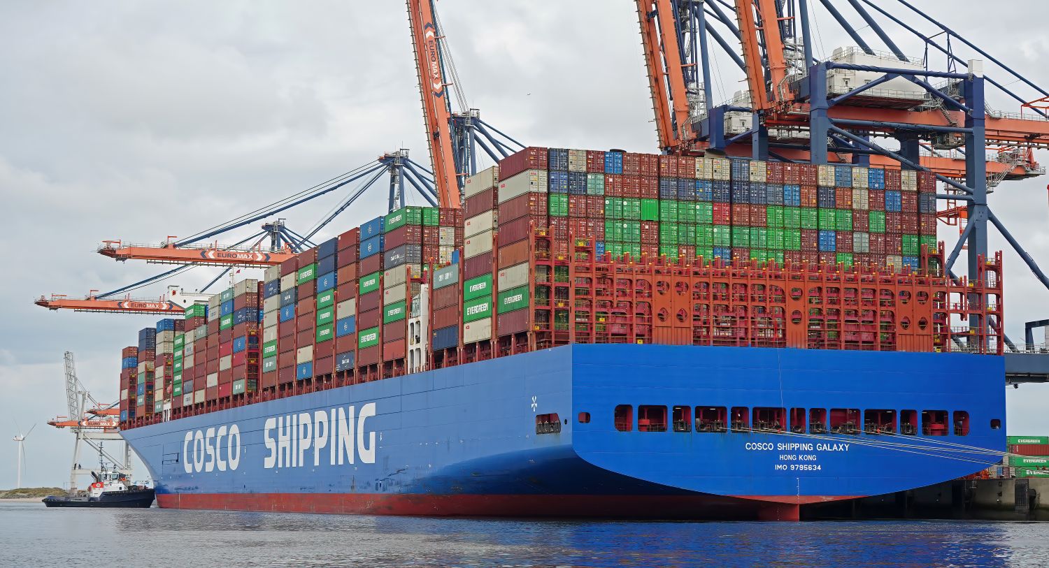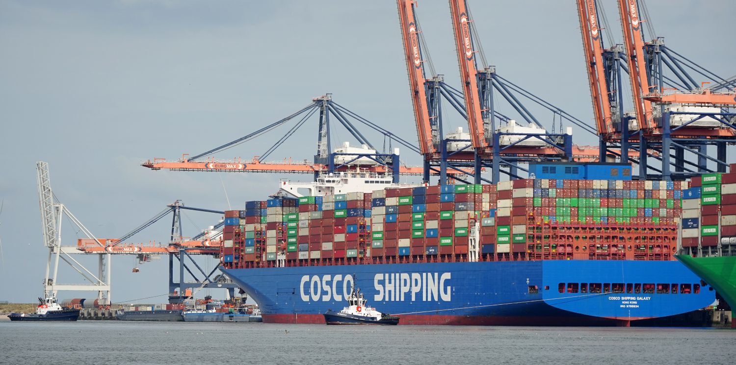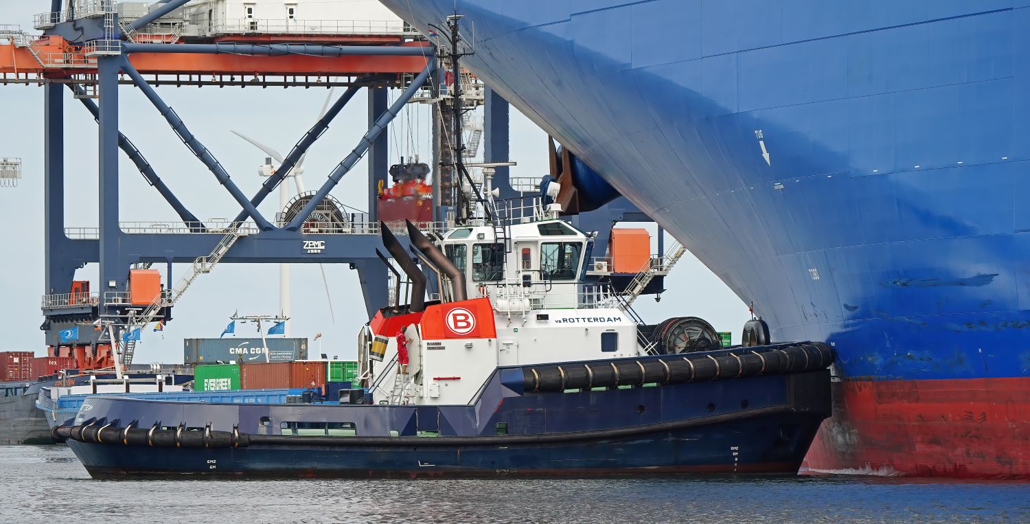 VB BEAGLE en VB ROTTERDAM van Boluda towage assisteerden het containerschip COSCO GALAXY met vertrek van de Euromax terminal in de Yangtzehaven Maasvlakte 1, gezien zondag 27-7-2025 vanaf de VEERWEL.