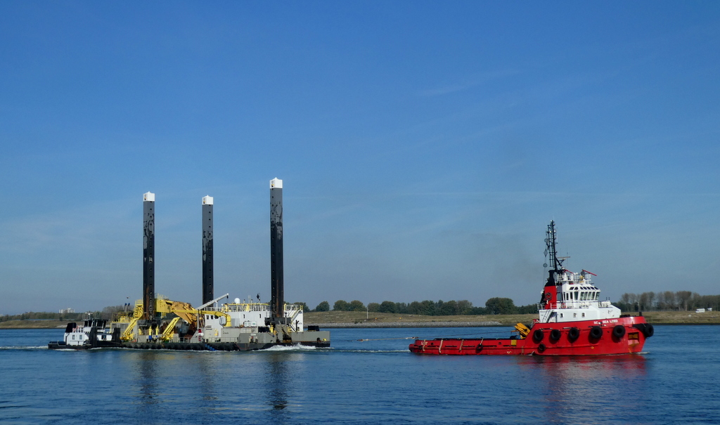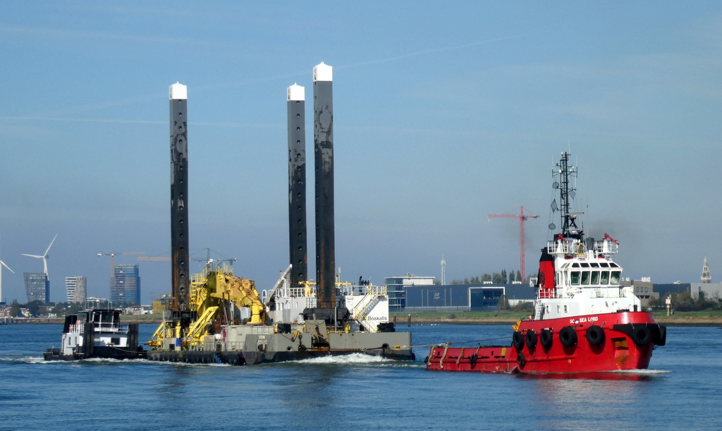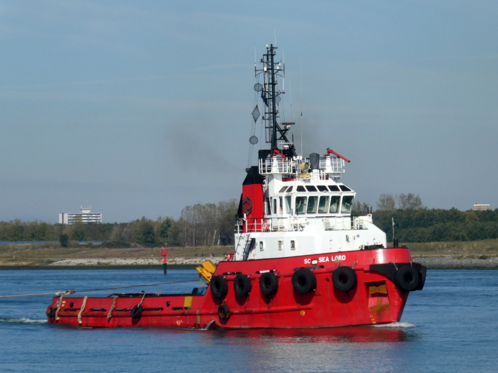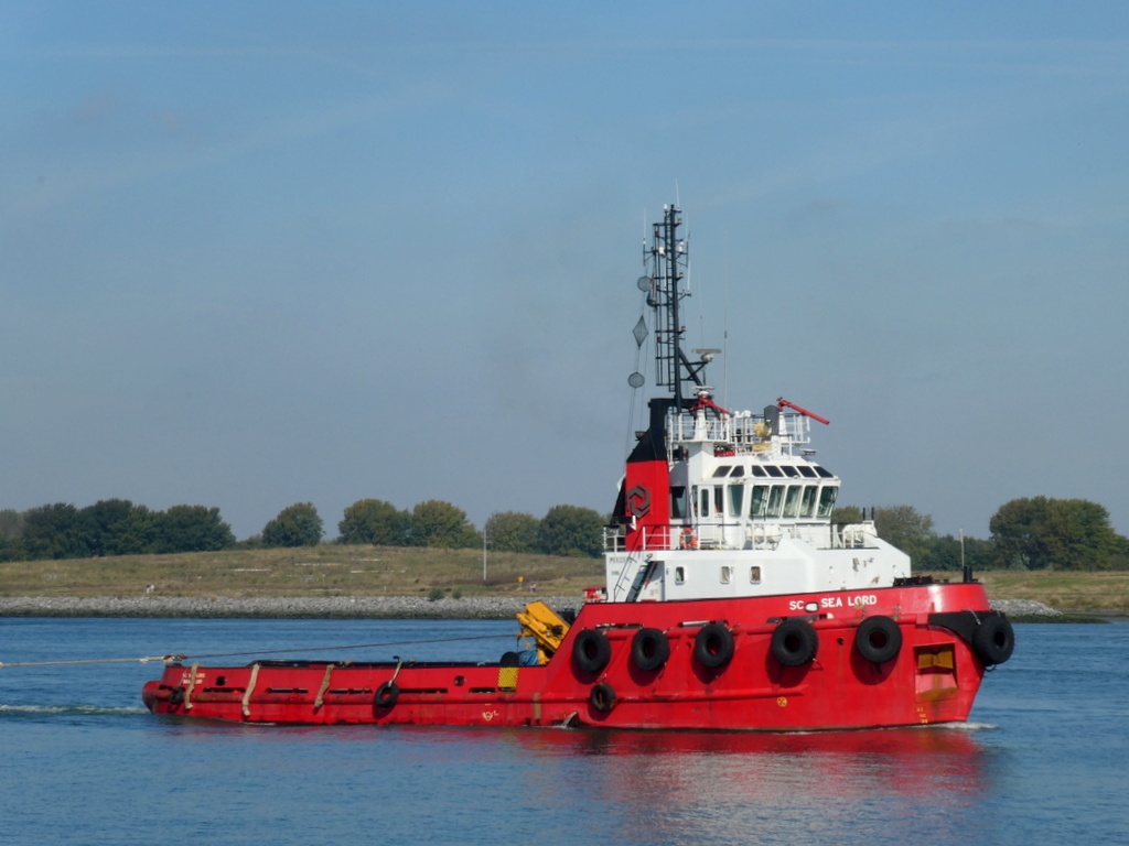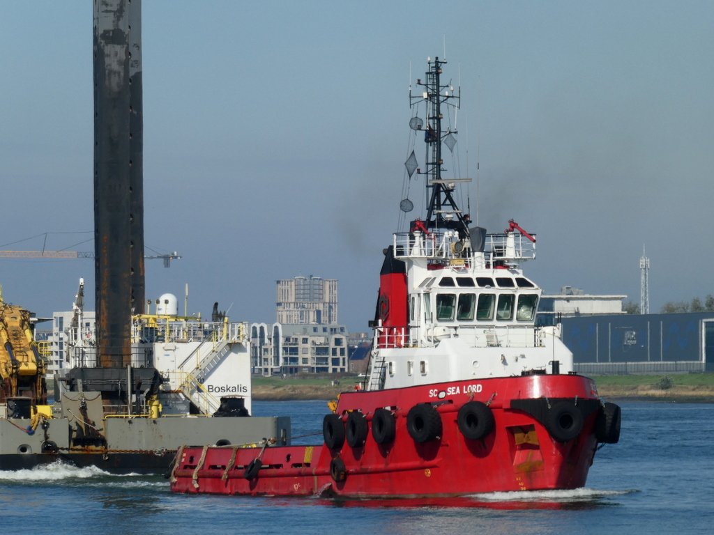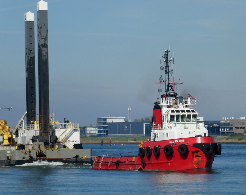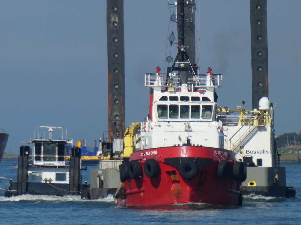 Zondagmiddag 28 september 2025, gezien in Het Scheur, vanaf de Scheurkade – Botlek, het sleeptransport van de sleepboot SC SEA LORD (1994) met ODIN. Assistentie verleende de duwboot SOMBRA. Bestemming: Waalhaven.