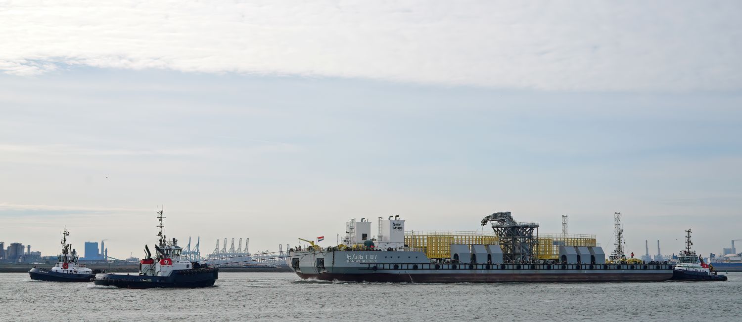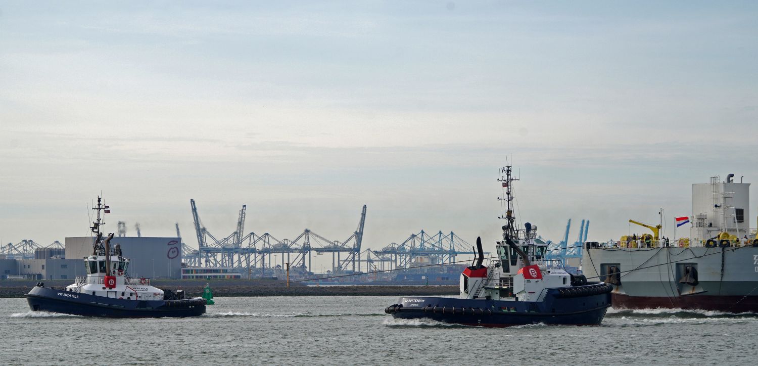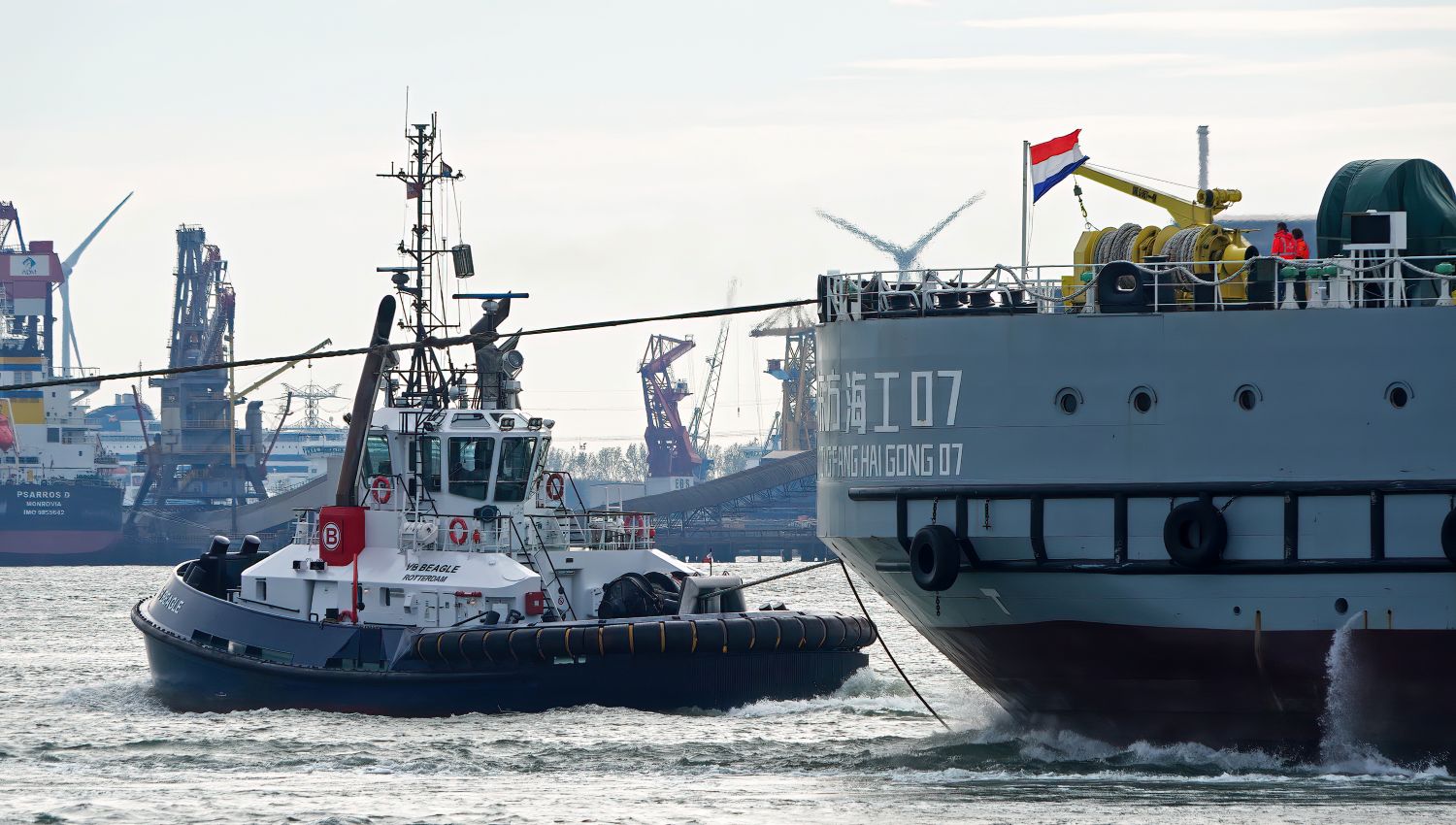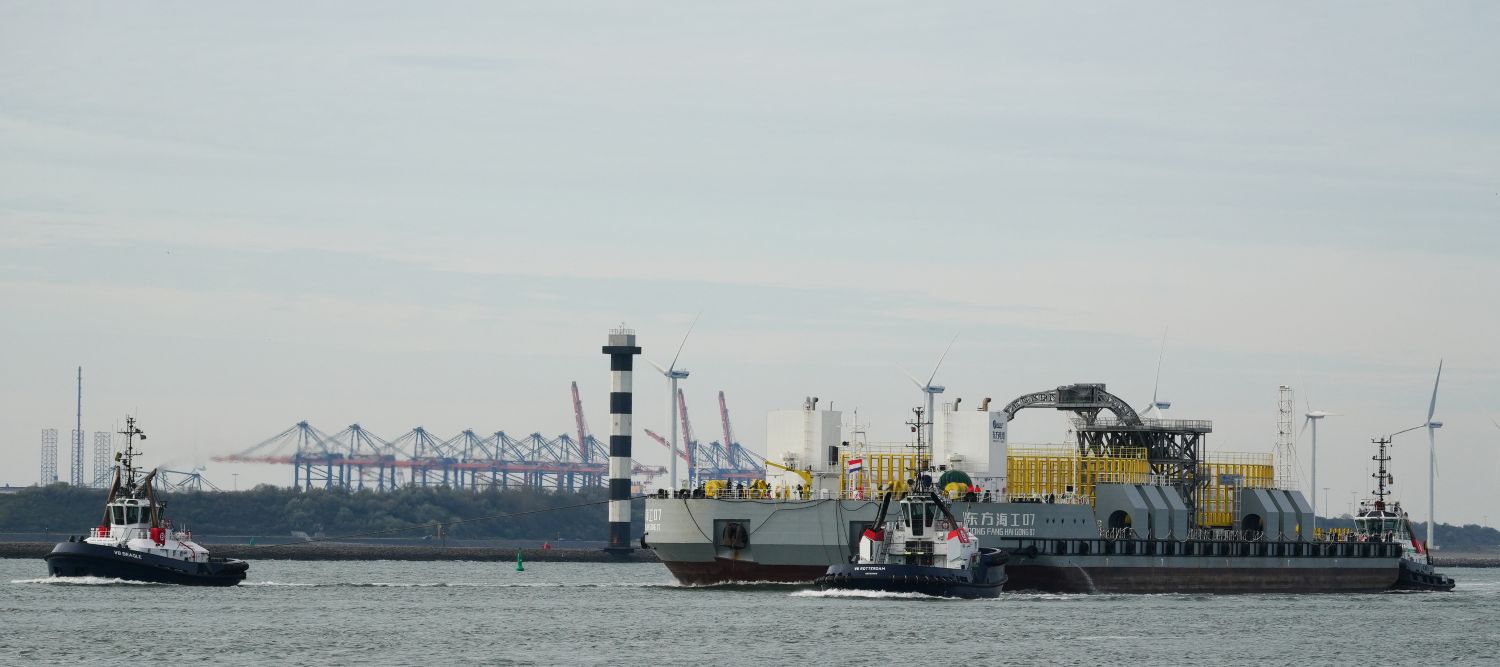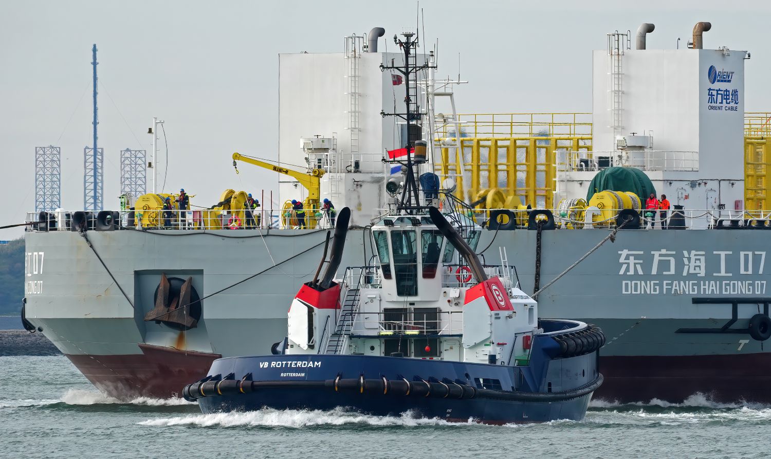 Zondagmiddag 19-10-2025 arriveerde de sleepboten CAMPERDOWN en GRAIGLEITH met de Cable Transport Barge DONG FANG HAI GONG 07 in de Maasmond, VB KRACHT , VB GINGER , VB ROTTERDAM en VB BEAGLE van Boluda towage namen de sleep over van de twee Engelse sleepboten en sleepten de Barge naar de Waalhaven in Rotterdam.