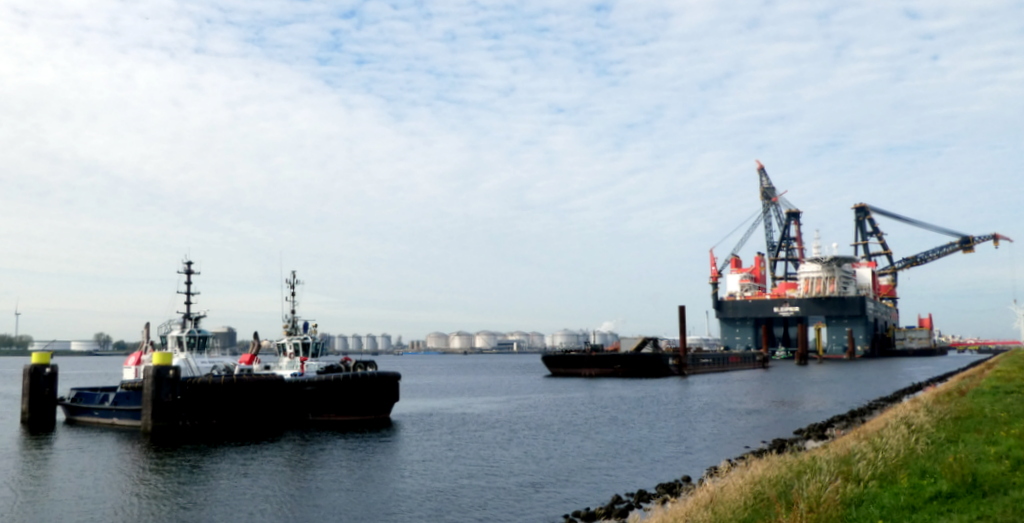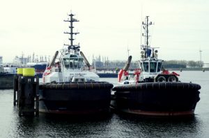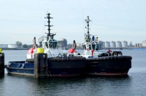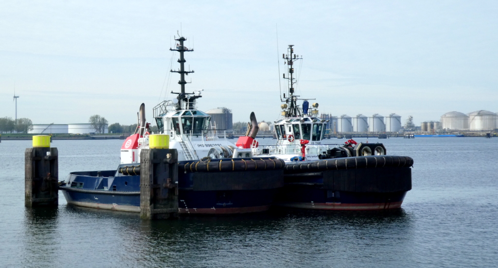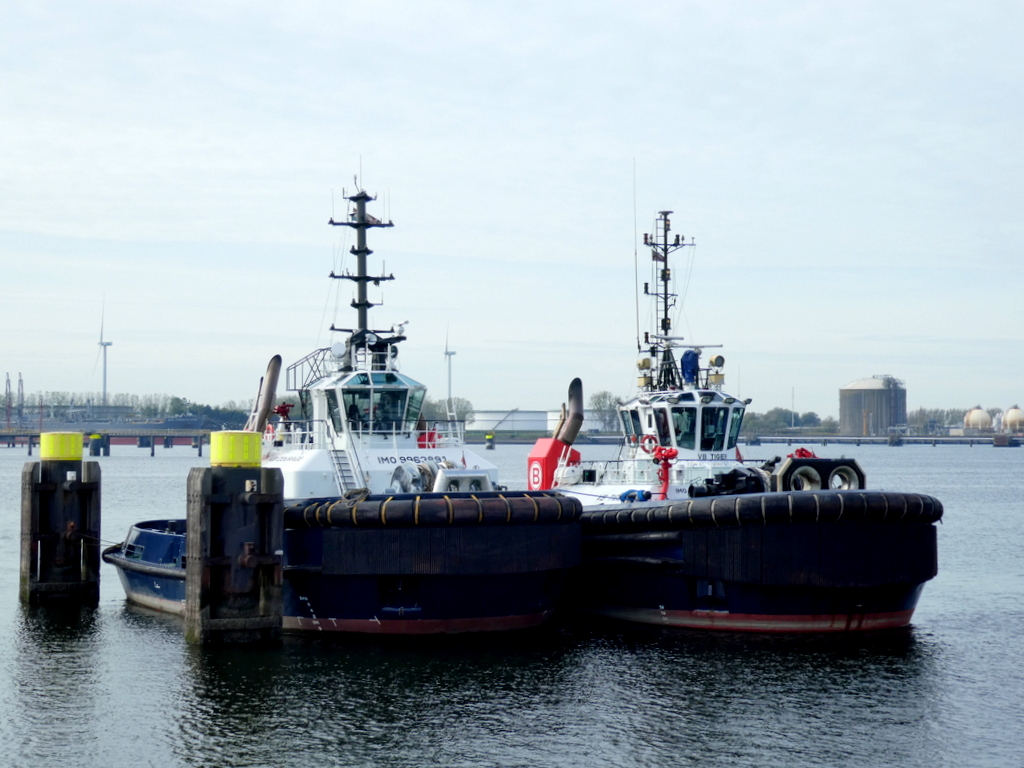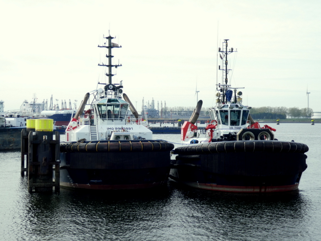 Zondagmiddag 19 oktober 2025 gezien in het Calandkanaal de Boluda sleepboten VB COURAGE en VB TIGER, op de wachtplaats voor sleepboten.